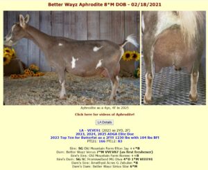 We are thrilled to have the opportunity to bring this stunning daughter of SG Old Mountain Farm Elton Jay +*B into our breeding program. Never in our wildest dreams did we we think would have an ADGA Elite/Top Ten Doe! Many thanks to Kathy Beck-Mullins of Better Wayz for trusting us with her. We brought her to our farm on 2/12/26 after her 1/26/26 fifth freshening, kidding of 4 bucklings.